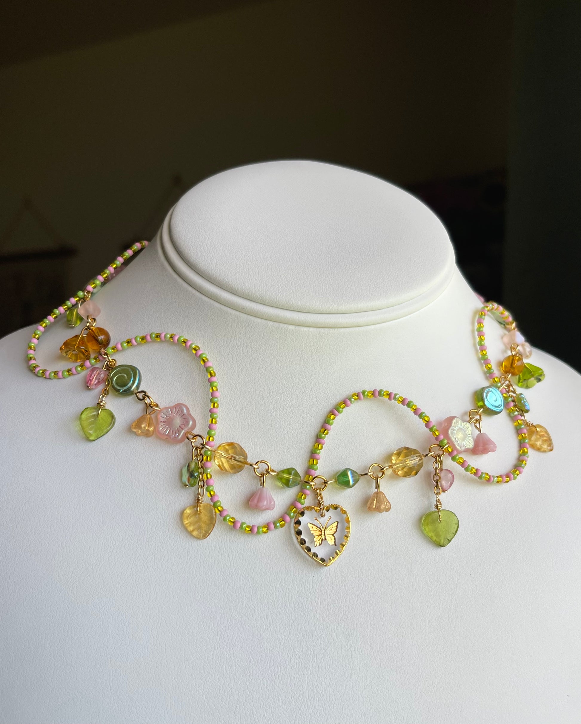 MATERIAL: made with gold plated stainless steel hardware, glass beads, high quality Czech beads, crystal bicone, a hand carved antique pendant and lots of love!