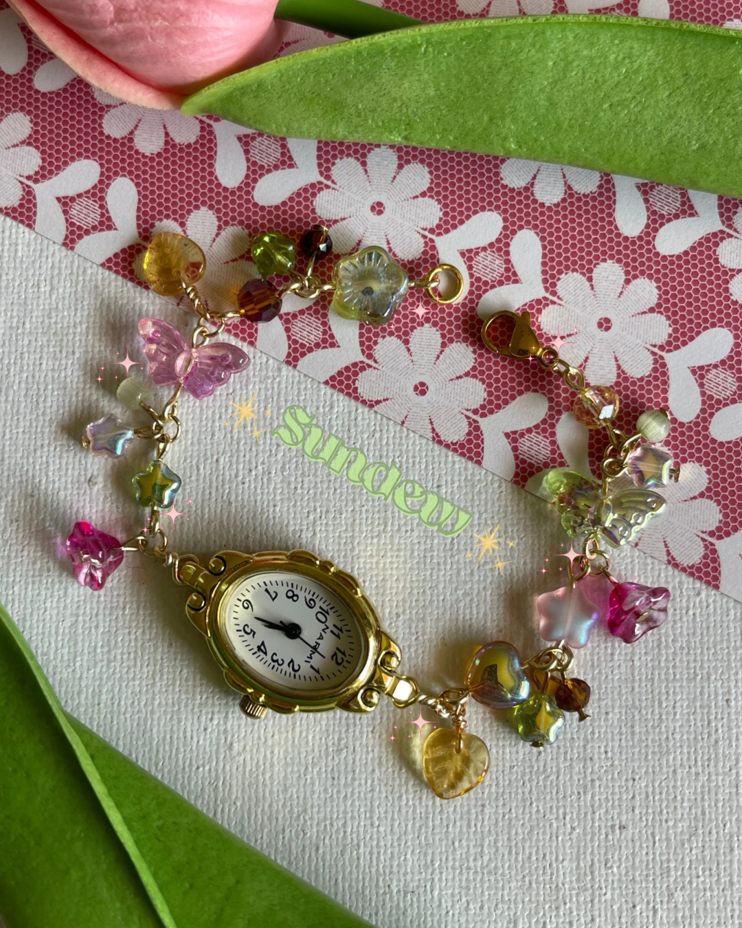 MATERIAL: made with gold plated stainless steel hardware, glass beads, high quality Czech beads, crystal bicone, stainless steel watch backing and lots of love!