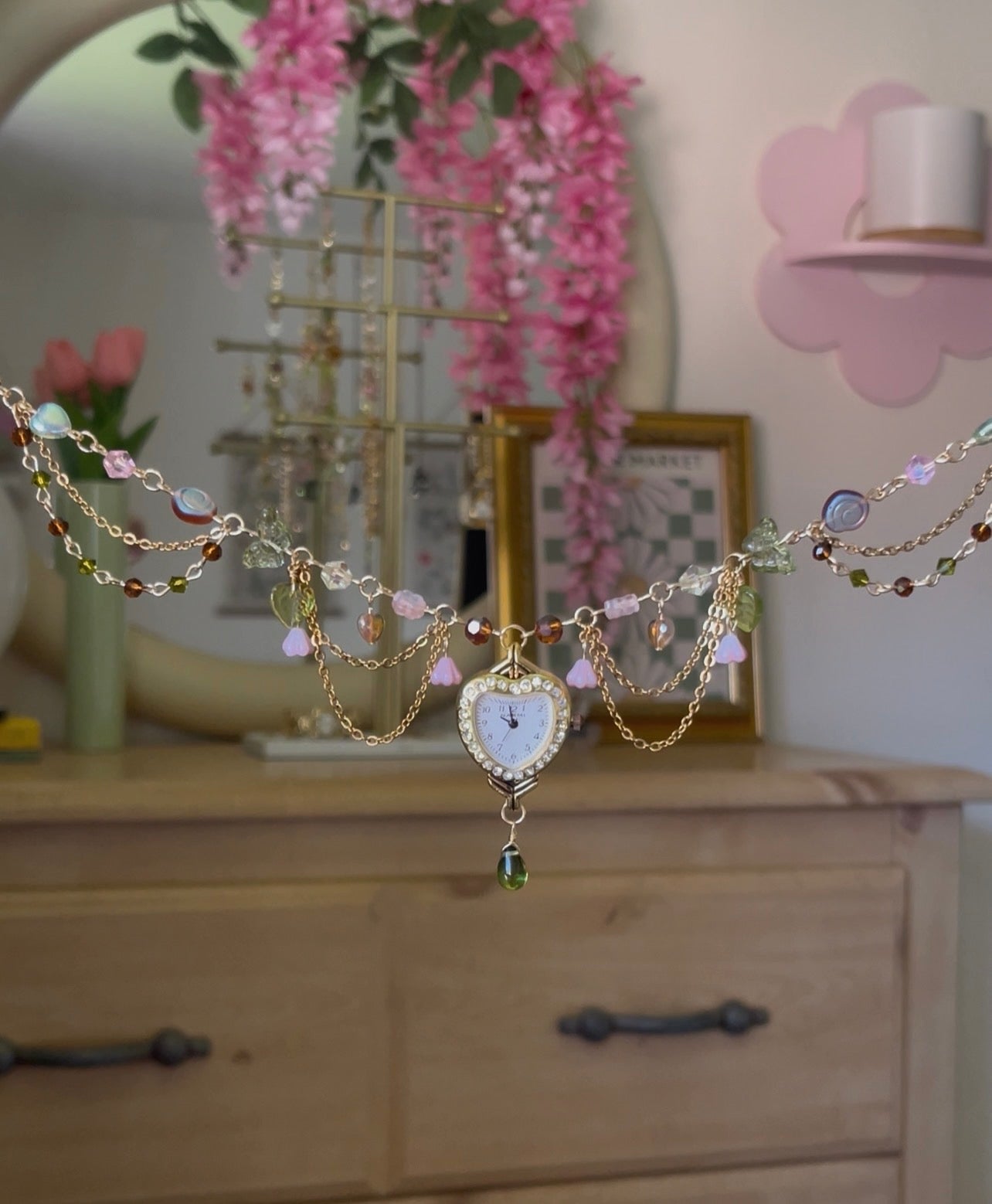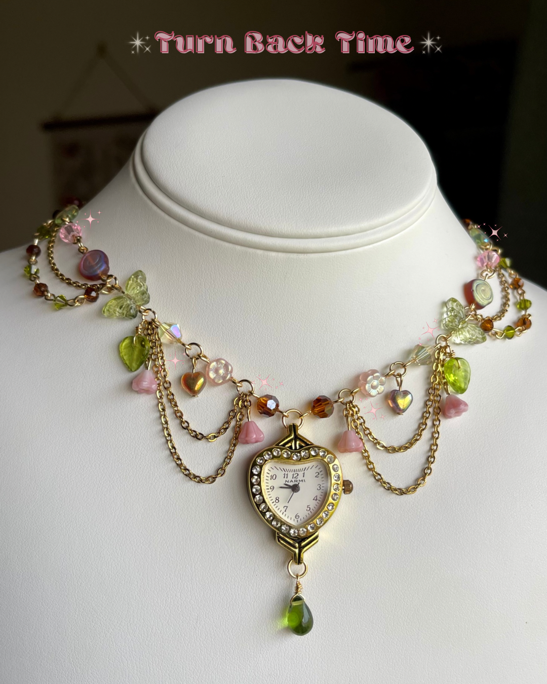 MATERIAL: made with gold plated stainless steel hardware, glass beads, high quality Czech beads, crystal bicone, a working heart shaped watch and lots of love!